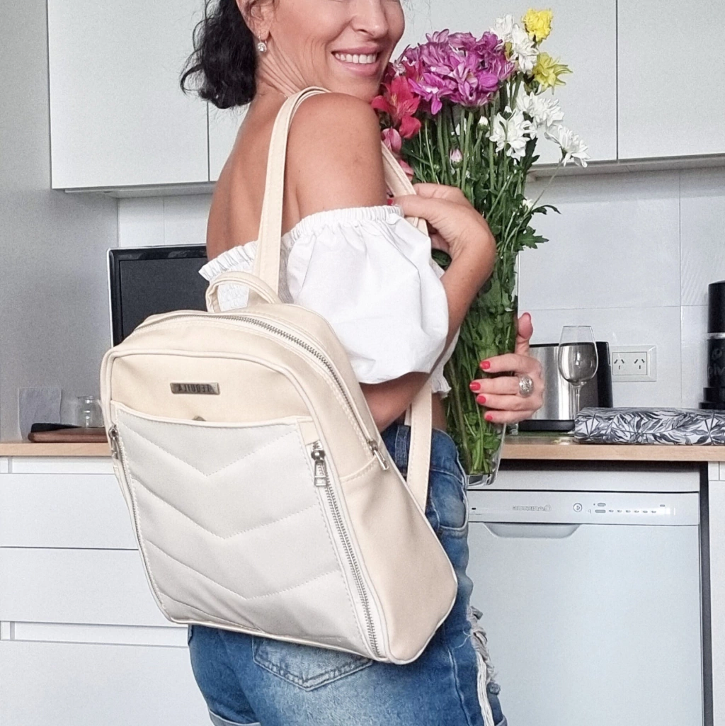 Mochila confeccionada en ecocuero PU importados de excelente calidad. Forro textil. Cierres y herrajes de metal zamak. Frente 2 bolsillos con cierre. Un bolsillo al frente cierre con imán. Adentro un bolsillo interno con cierre. Correas regulables. Manija de mano Medidas Alto 31 cm Ancho 30 cm Profundidad 11 cm