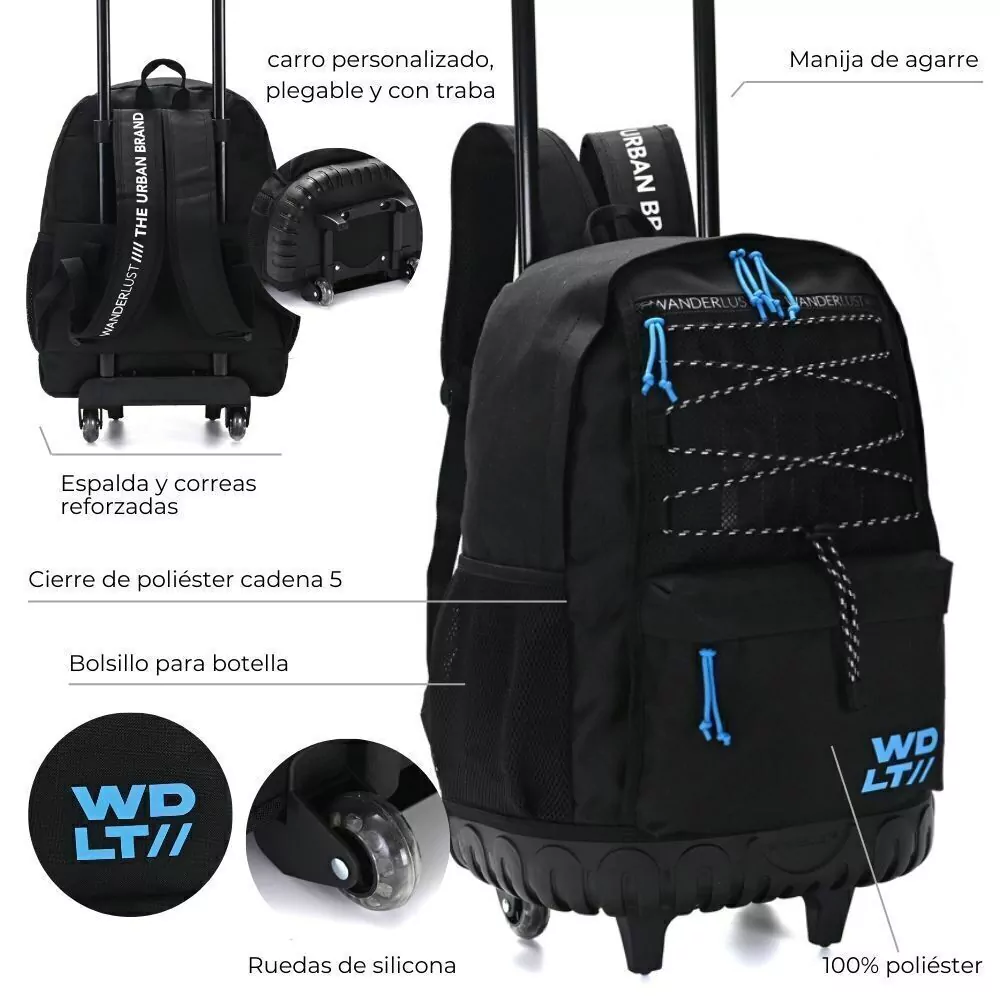 MOCHILA WANDERLUST 37419 WANDERTEAM 18´´ CARRO• Diseño moderno y atractivo, ideal para todos los que aman la aventura.• Cuenta con un carro resistente, facilitando el transporte.• Amplio espacio de almacenamiento para libros, útiles y más.• Material de alta calidad, resistente al desgaste y fácil de limpiar.• Perfecta para el uso diario en la escuela o paseos.¡No dejes pasar esta oportunidad y adquiere tu mochila Wanderlust hoy mismo!