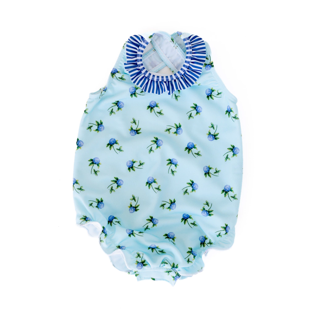 ·       Bombachudo con botoncitos a presión para pañal. Bretel cruzado. Voladito en composé. Traje de baño forrado.