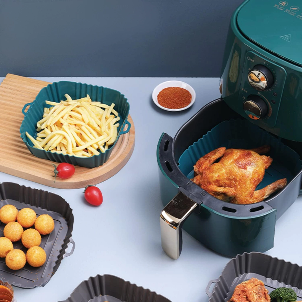 La forma cuadrada se adapta perfectamente a la mayoría de las freidoras de aire. Cuenta con bordes altos para evitar derrames y mantener los alimentos contenidos durante la cocción.