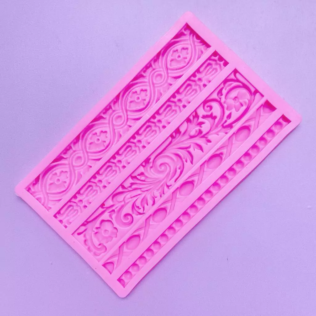 molde de silicona molduras x 5medidad total: 18,5 cm X 11,5 cm aprox.moldura largo 17 cm aprox.moldura ancho entre 2,5 ; 1,5 ; 3 ; 1 ; 0,7 cm aprox.- Fácil de usar, limpiar y desmoldar.- Ideal para masas comestibles, porcelana fría, Chocolate- Material: 100% Silicona