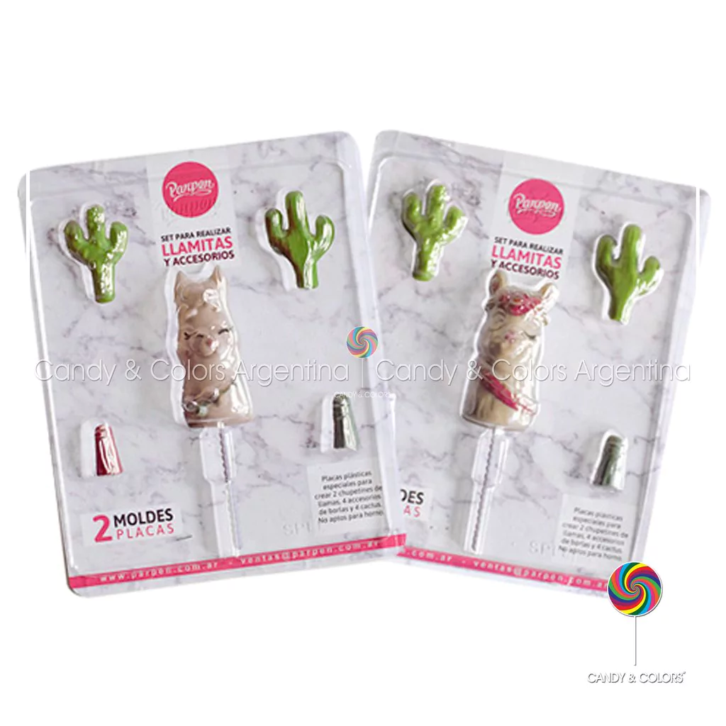 Set compuesto de 2 moldes placas plásticos para crear 2 chupetines de llamas, 4 accesorios de borlas y 4 cactus.No aptos para horno.
