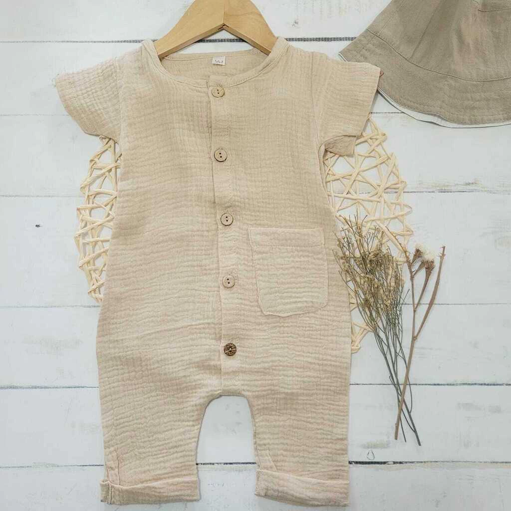 Monito de gasa baby cotton en color camel. Con botones al tono .Es una prenda super fresca , comoda y totalmente unisex.Mono linoTalleLargo totalLargo tiroAncho3-6 meses4140276-9 meses5341289-12 meses55432912-24 meses57453324-36 meses694634