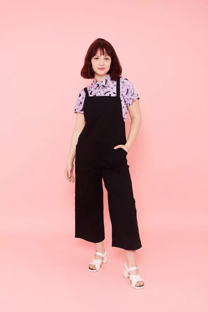 Mono con breteles regulables y botones en los laterales. Bolsillos laterales y traseros. Se puede regular el largo desde los breteles con botones en la espalda. No es entallado, tiene un corte recto