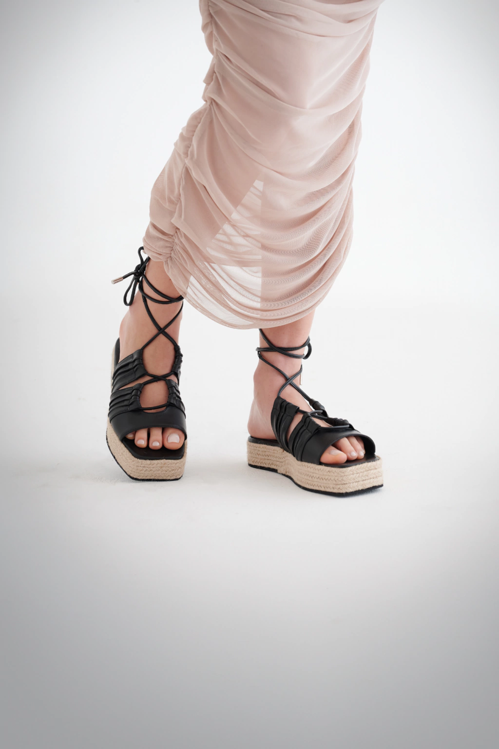 Sandalias con base de eva forrada en yute natural, confeccionadas en cuero genuino napa color negro. Con detalle de frunces y calce regulable mediante cordones del mismo cuero. La plataforma tiene 4 cm de altura. Son súper livianas y cómodas, un must para cualquier fit de verano!TABLA DE TALLES (te recomendamos llevar tu talle habitual de calzado de verano. La horma es normal y la capellada es regulable. Cualquier duda, consultanos!)35 23 cm36 23,5 cm37 24 cm38 25 cm39 25,5 cm40 26 cm41 27 cm42 28 cm
