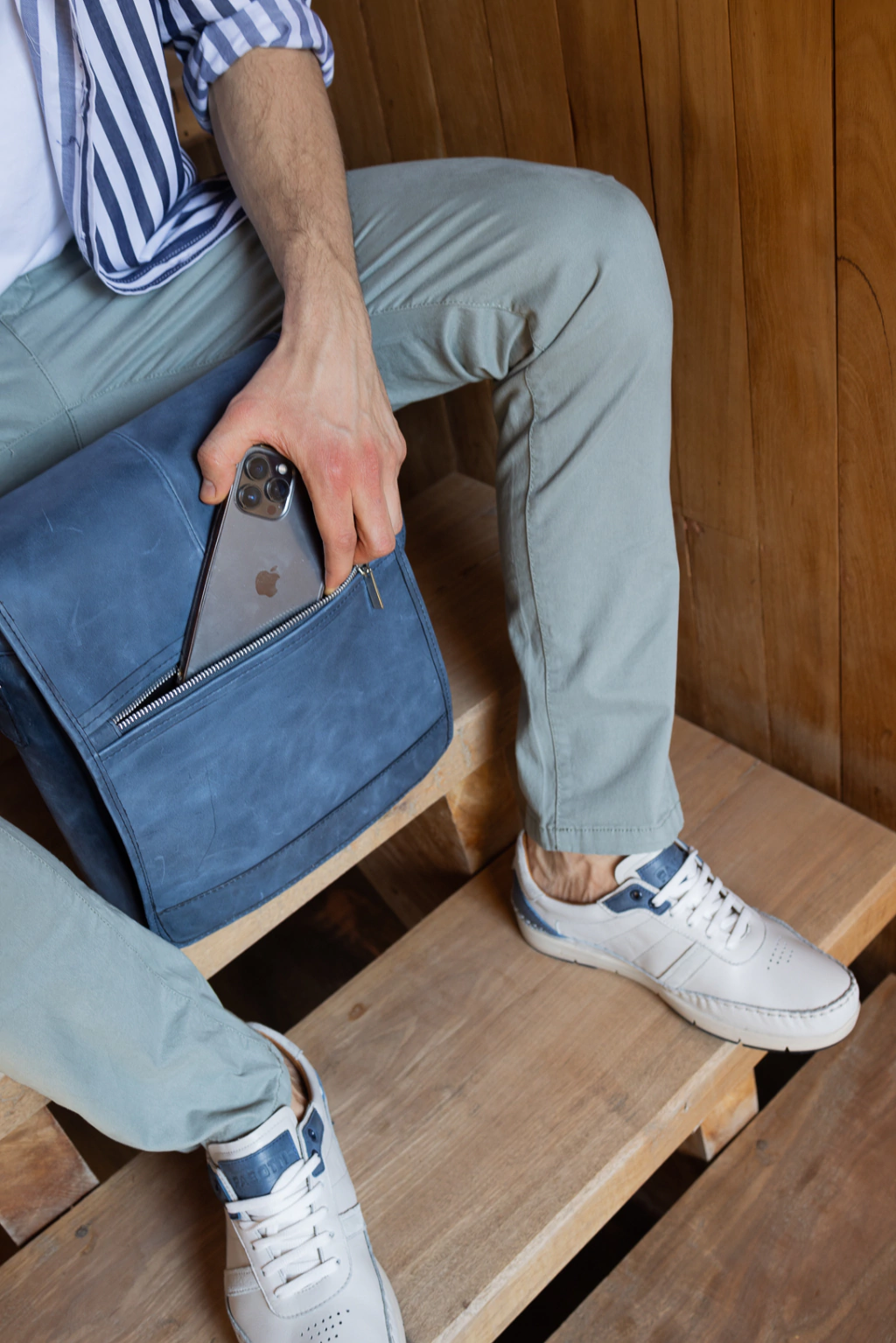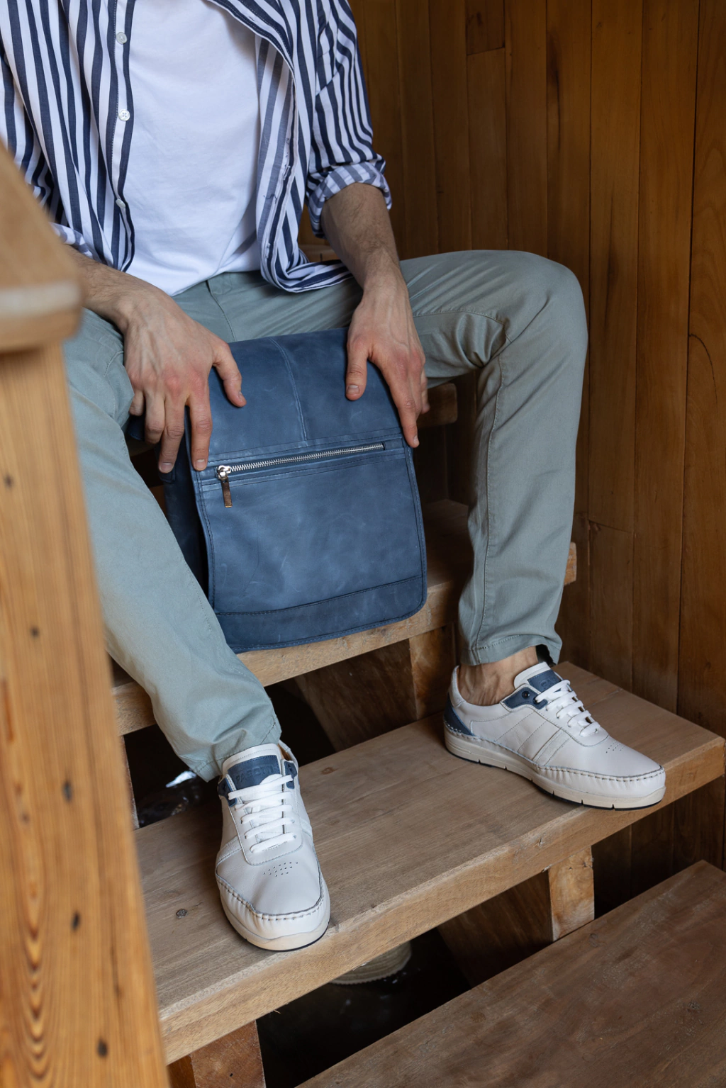 Morral de cuero con solapa con cierre imantado, bolsillo externo y cierre color niquel. Bolsillo interno con cierre. Correa regulable de cuero.Medidas: 35Cm. x 30Cm