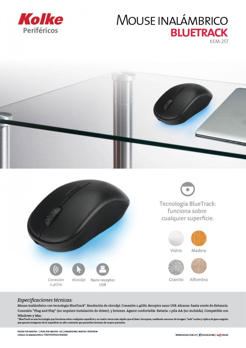 El mouse inalámbrico Bluetrack KEM-257 de Kolke es un dispositivo diseñado para ofrecer precisión y comodidad en cualquier superficie. Su tecnología BlueTrack lo distingue, ya que permite un seguimiento más rápido y preciso que los láseres tradicionales, incluso en superficies irregulares o con poca luz.