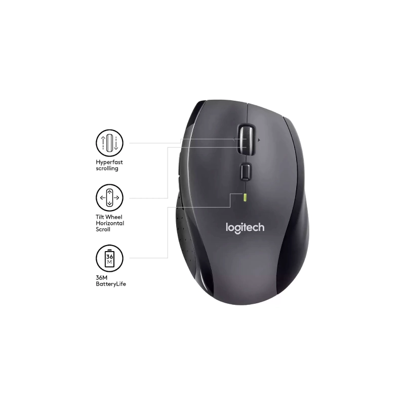 Logitech M705 Marathon Wireless Mouse - Batería de larga duración de 3 años, forma ergonómica con la mano derecha, receptor ultrarrápido de desplazamiento y unificación USB, para computadoras y computadoras portátiles, gris oscuroLARGA DURACIÓN DE LA BATERÍA: la duración de la batería de 3 años y el apagado automático lo ayudan a prolongar los cambios de batería: el M705 usa menos de la mitad de la potencia de los ratones inalámbricos comparablesDESPLAZAMIENTO HIPER-RÁPIDO: recorra documentos largos o páginas web de forma más rápida y sencilla. O presione la rueda y cambie al modo de clic para hacer clic para obtener una navegación precisaFORMA ERGONÓMICA: el diseño esculpido de la mano derecha guía tu mano a una posición naturalmente posicionada y coloca un control personalizable a tu alcanceCONTROLES PROGRAMABLES: configura los botones para hacer exactamente lo que quieres, como cambiar de aplicaciones, abrir ventanas del navegador o saltar a pantalla completa mientras ves videosCONEXIÓN PLUG'N'PLAY: el receptor unificador inalámbrico Logitech de tamaño nanométrico permanece en su computadora: conéctelo, olvídelo e incluso agregue dispositivos inalámbricos compatibles sin múltiples receptores USBConozca el mouse inalámbrico que sigue funcionando, no solo mes tras mes, sino durante tres años con un juego de baterías *. Por lo tanto, ahora siempre puedes completar la tarea en cuestión sin perder el ritmo.Batería de tres añosLa vida útil de la batería de hasta tres años lo ayuda a ahorrar tiempo, dinero y al planeta prácticamente eliminando la necesidad de cambiar las baterías. Una luz indicadora le avisa cuando la batería está baja.Receptor Unificador LogitechEl pequeño receptor inalámbrico permanece en su computadora portátil, por lo que no es necesario que lo desenchufe cuando se mueva. Además, puedes agregar fácilmente un teclado o mouse compatible.Desplazamiento hiper-rápidoVolarás a través de documentos y páginas web con un solo giro. Luego, haga clic en desplazamiento para obtener la precisión que necesita al navegar por listas, diapositivas e imágenes.Seguimiento de grado láserLa precisión de grado láser significa que disfrutará de un seguimiento y control de cursor increíblemente suaves y precisos en casi cualquier superficie.Diseño de mano derecha esculpidoLa forma esculpida guía su mano a una posición naturalmente posicionada y coloca un control personalizable a su alcance con el software Logitech Options.Requisitos del sistemaWindows Vista, Windows 7, Windows 8, Windows 10 o posteriormacOS X 10.4 o posteriorPuerto USBConexión a internet (para descarga de software)