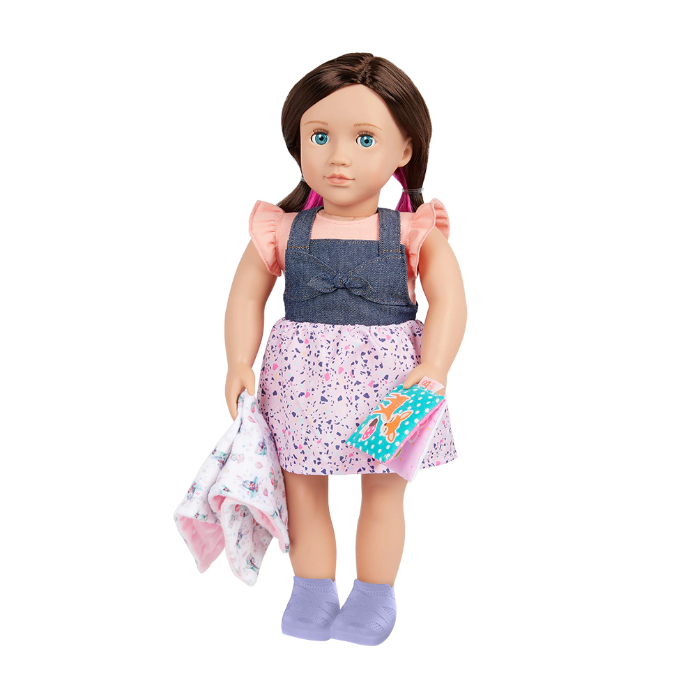 ¡Haz que las aventuras de cuidar niños sean una maravilla con Katherine! ¡Esta muñeca Our Generation de 46 cms tiene ojos azules brillantes que se abren y cierran, y su largo cabello castaño, que se puede cepillar, presenta un matiz fucsia para crear estilos coloridos!