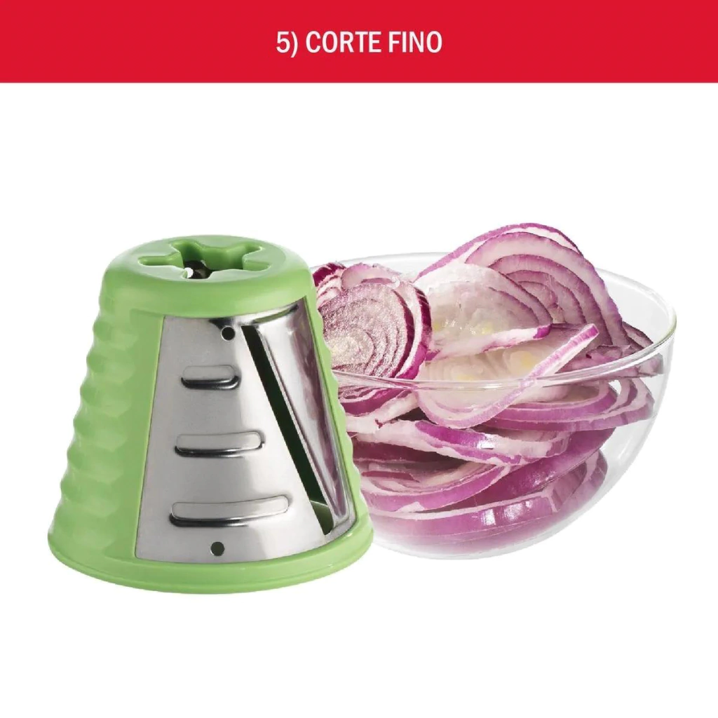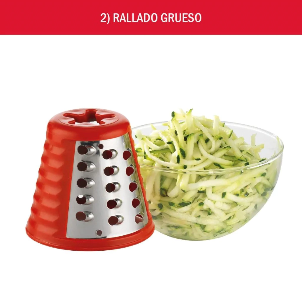 • 5 conos con 5 funciones (rallado fino, rallado grueso, picado, corte fino y corte ondulado)