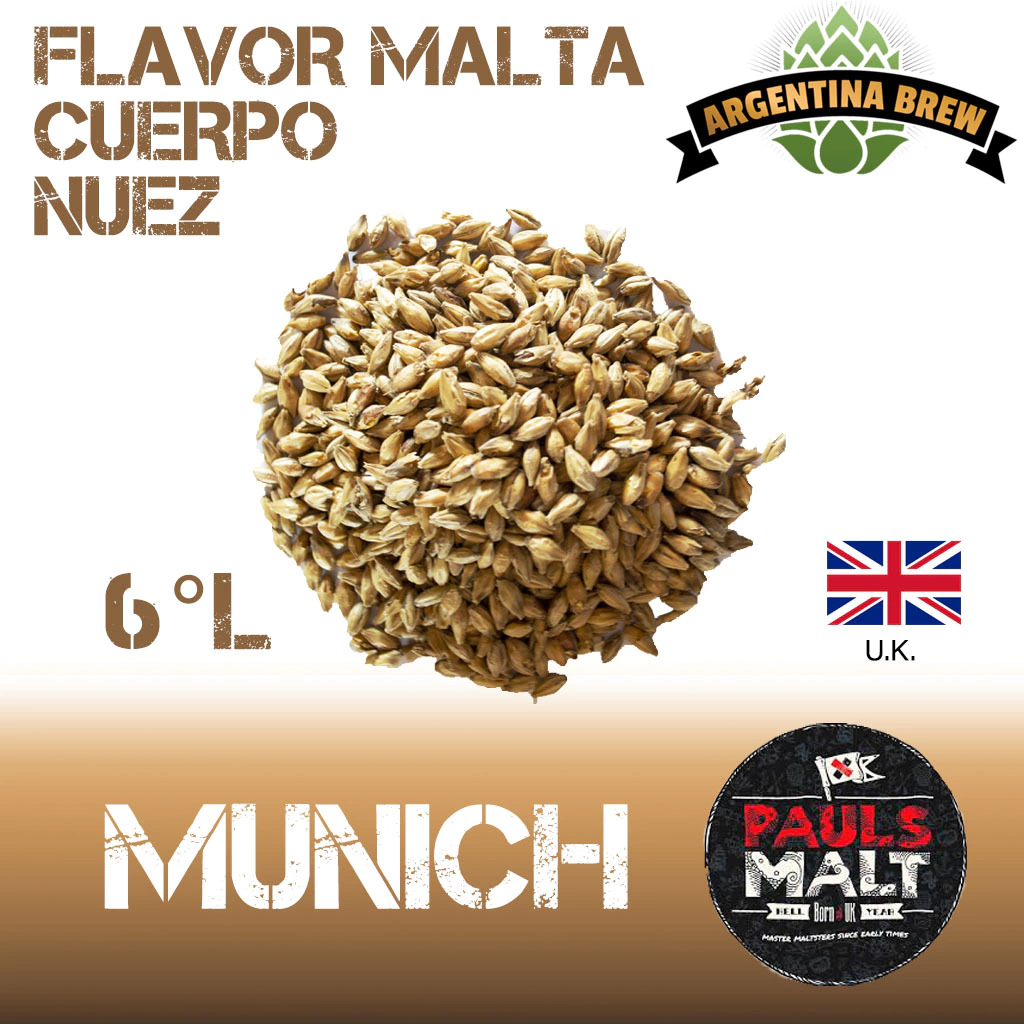 Maltas oscuras y aromáticas con profundos sabores a nuez, malta y galletas. Munich Malt se elabora con el mismo proceso que la malta lager Pilsner, pero la germinación se acorta, con cierta formación de color en la germinación debido a la recirculación prolongada, mientras que el horneado se realiza a temperaturas más altas para el desarrollo del sabor y el color. Aporta sabor y color a la cerveza. Tiene un contenido característicamente alto de melanoidina, que produce maltas oscuras y ricas en aroma con sabores profundos a nuez, malta y galletas.