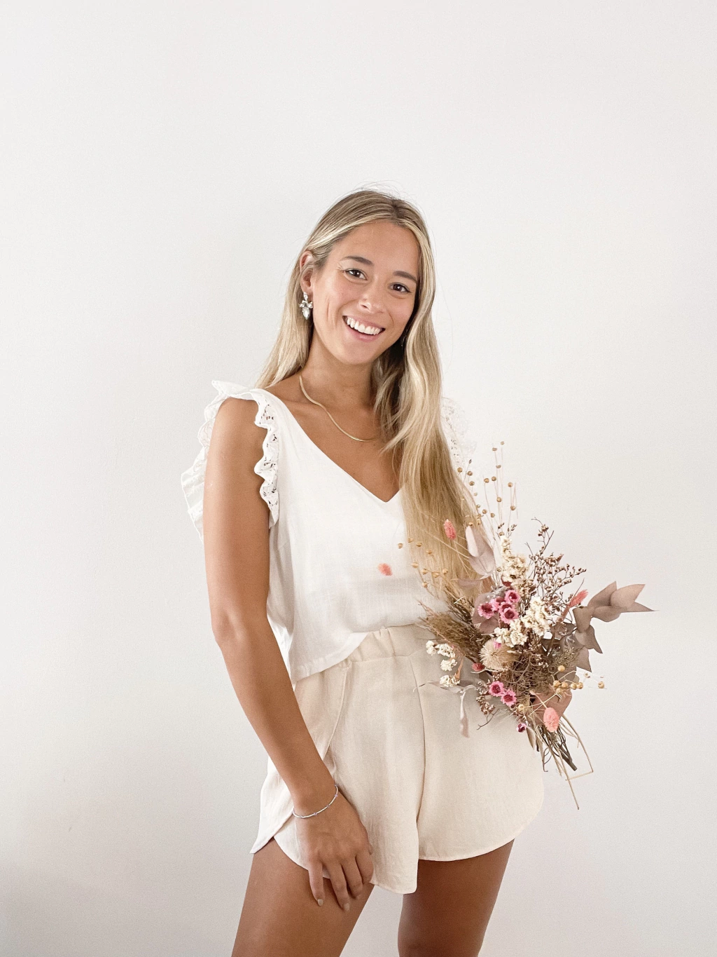 Musculosa de lino con espalda para atar con lazo y detalle de broderie en mangas.MEDIDASAncho de busto50 cmLargo42 cm