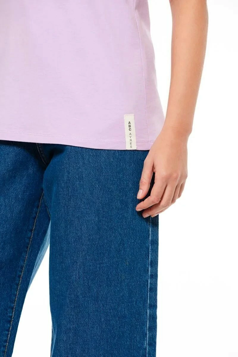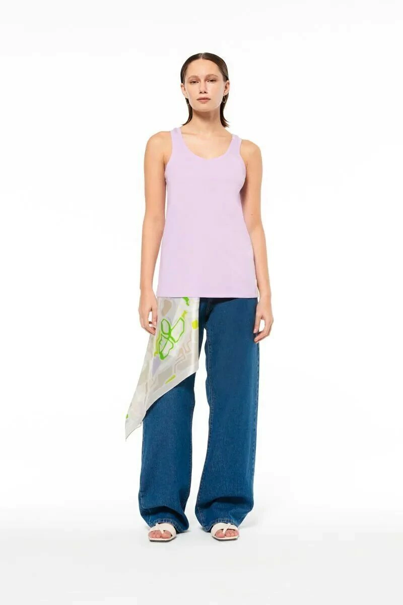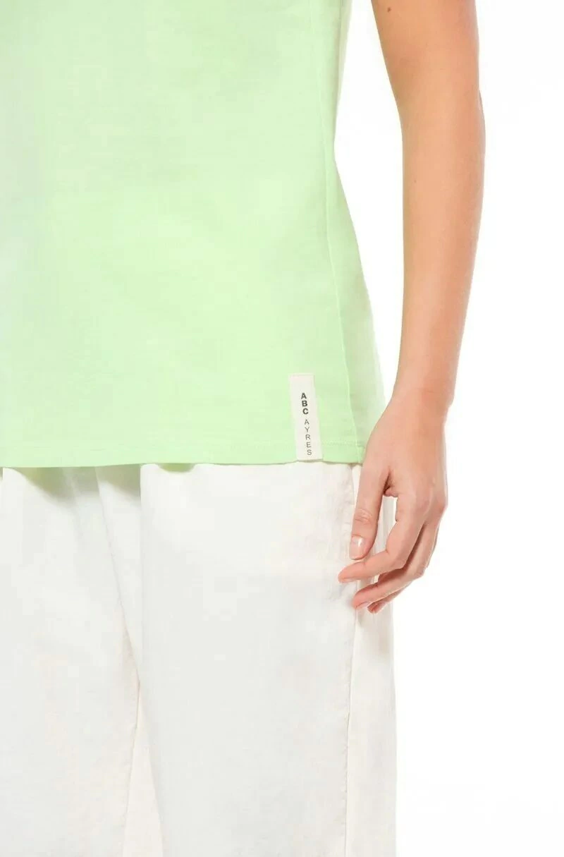 Musculosa AYRES de algodón americano con sisas y escote redondeado terminados con vivo que contiene un recorte pisado con bordador en centro espalda, pertenece a la linea abc. La modelo mide 1.74 cm. usa talle 40.