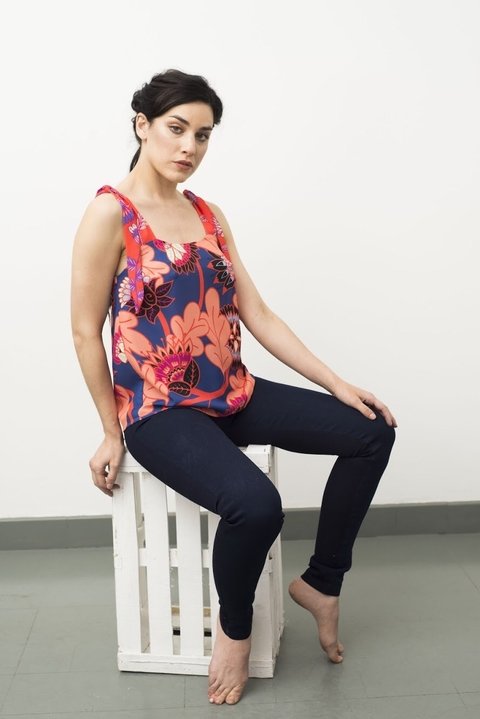 Musculosa nudos en crepe, con estampa de Laura Varsky.En stock: 3 talles 1Medidas de la prenda tomadas en contorno:talle 1(cm)talle 2(cm)talle 3 (cm)contorno busto849096contorno ruedo100106112largo desde hombro606162