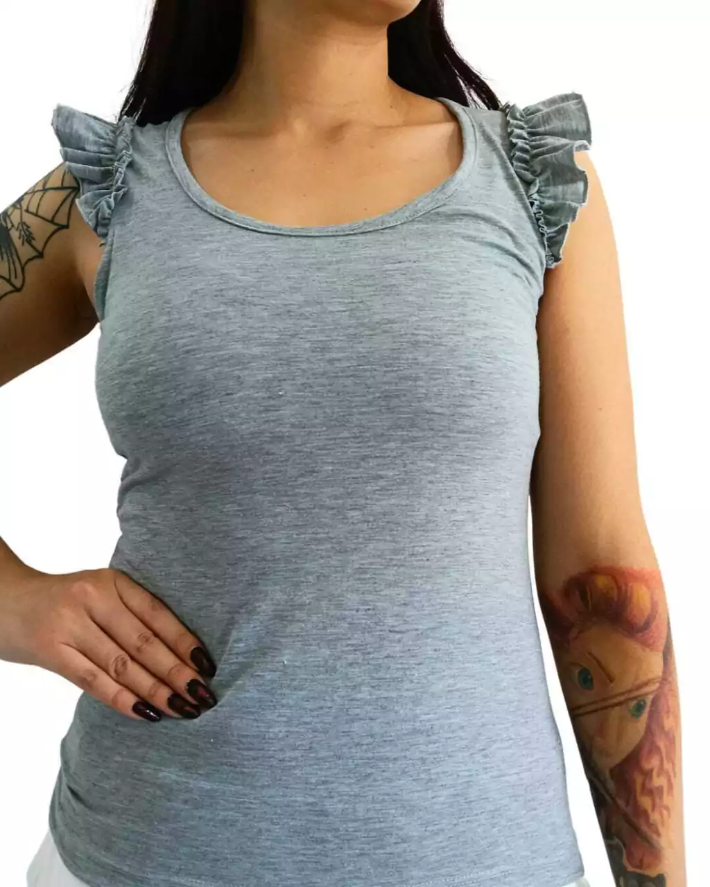 Musculosa al cuerpoAlgodon con lycra premium con volados en sus mangasTalle S/MAncho 44 cm (88 cm contorno)Largo 56 cm