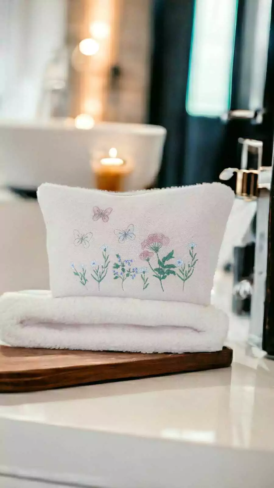 Neceser de tusor bordado con motivo floral. Súper cabedor, mide 20 x 30 y tiene una profundidad de 5 cm en la base. Forrado en gasa de algodón.