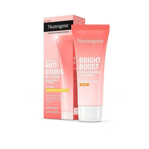 Neutrogena BRIGHT BOOST SPF 30 40gNeutrogena Bright Boost Moisturizer con SPF 30 contiene el poderoso activo Neoglucosamina, que acelera la renovación celular para igualar el tono de la piel y reducir las líneas finas.Combate los principales signos del envejecimiento, purifica la piel, la protege de la contaminación, ayuda a limpiarla más fácilmente y hace que sea más resistente al estrés ambiental. Funciona bien debajo del maquillaje.Su fórmula actúa sobre 8 factores para combatir los daños por contaminación: pérdida de brillo, elasticidad, firmeza, untuosidad, oscurecimiento de la piel.Presentación: Pote 40 gBeneficios:•Combate los principales signos del envejecimiento provocados por la contaminación.•Fórmula que actúa sobre 8 factores para combatir los daños por contaminación: pérdida de brillo, elasticidad, firmeza, untuosidad, oscurecimiento de la piel.•Deja la piel más radiante, renovada y saludable.•Formulado con poderosos antioxidantes vitamina C y E.•Funciona bien debajo del maquillaje.•Protege la piel de la contaminación.¿Como y cuando usarlo?Aplique con suaves movimientos sobre la piel limpia del rostro y cuello.Es necesaria la reaplicación del producto para mantener su efectividad.Advertencias y precauciones.Lea atentamente el rótulo del producto antes de su uso. Si observa alguna reacción desfavorable, suspenda su uso, en caso de que persista, consulte al médico. Mantener el producto fuera del alcance de los niños. USO ADULTO. Este producto no es un protector solar.¡COMPRALO!