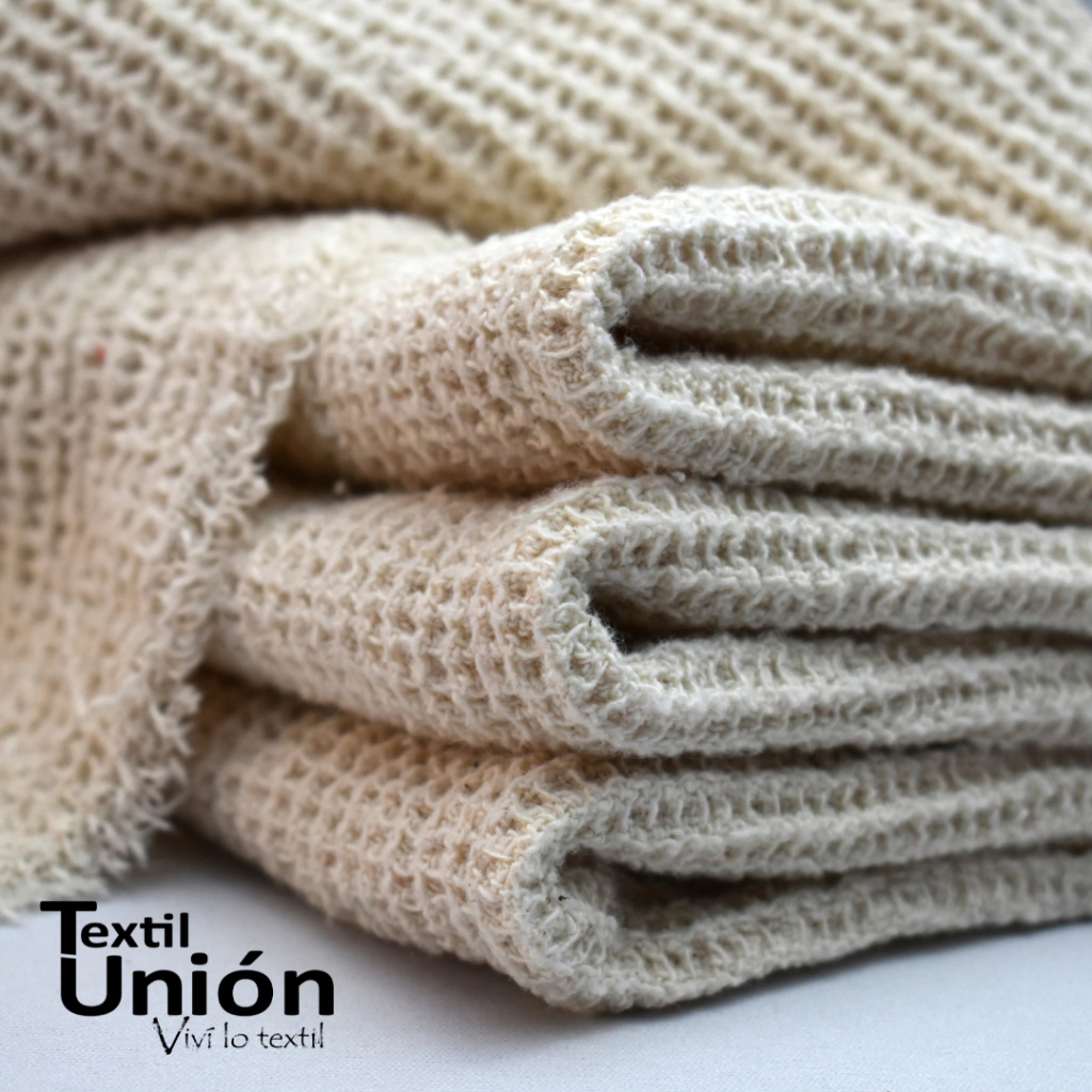 DESCRIPCIÓNEl género nido de abeja presenta una trama con relieve en forma de panal de abeja, el cuál se puede observar en ambas caras del género. Es un tejido suave, consistente y pesado al tacto.