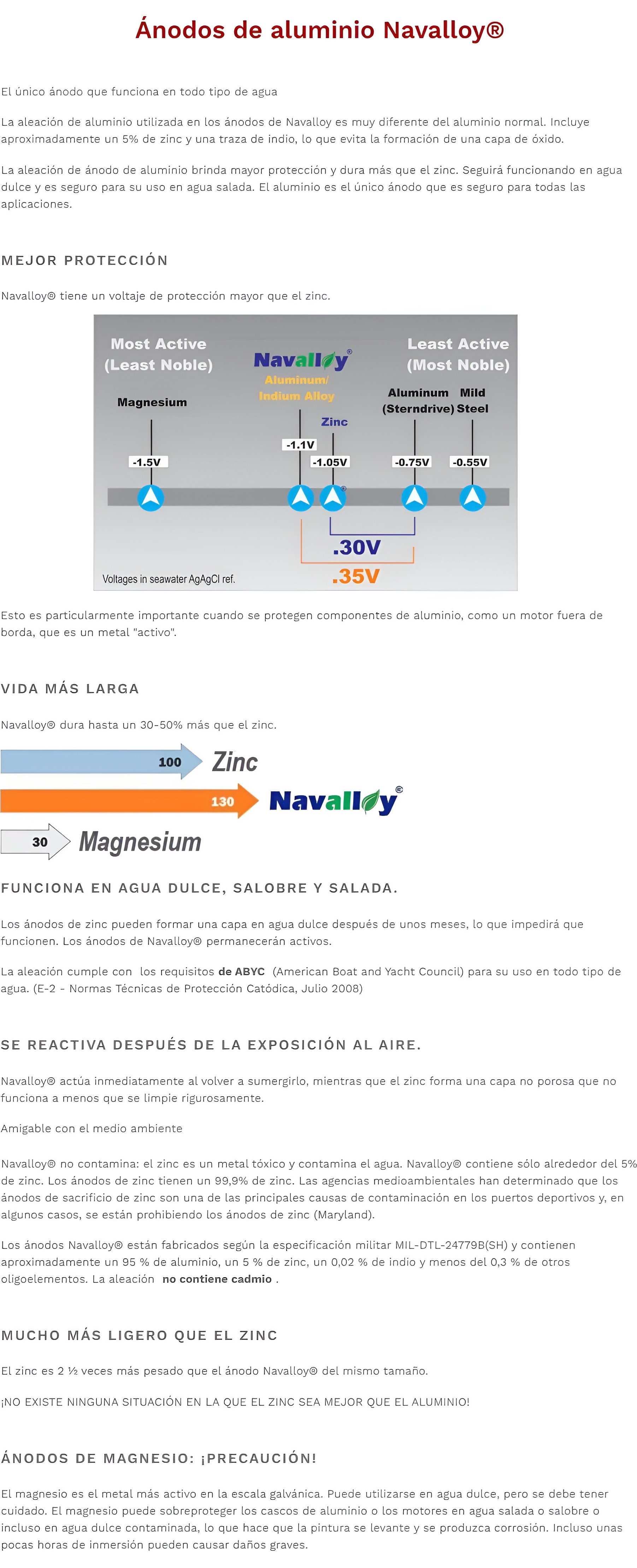 Los ánodos de aluminio Performance Metals Navalloy® se fabrican según la especificación militar MIL-DTL 24779 y son adecuados para su uso en todo tipo de agua: salada, salobre o dulce.