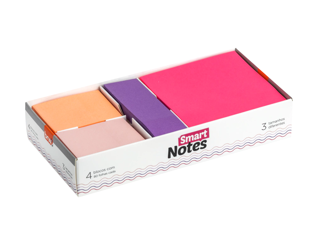 Caja ideal para regalar y tener en el escritorio, compuesta por 4 blocks de notas adhesivas!1 block 75x75 mm de 80 hojas color fucsia1 block 25x75 mm de 80 hojas color violeta2 blocks 37,5x50 mm de 80 hjs color rosa y color coral.