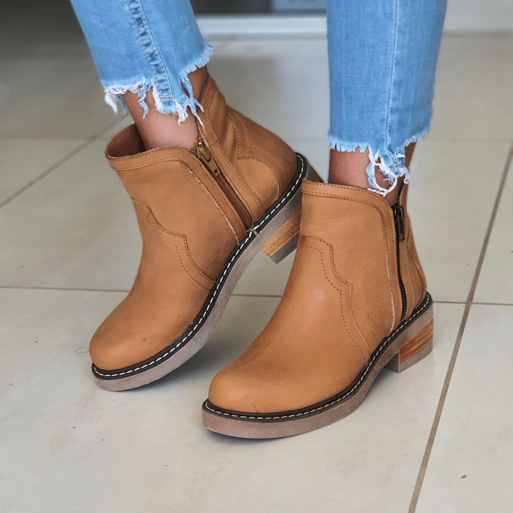 Botas arriba del tobillo en cuero vacuno color habano y costura decorativa. Base TR antideslizante. #agustinoshoes #aw21Taco 3cm.Plataforma 1cm.Horma: Normal