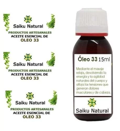 Saiku Natural Te Ofrece :¿ Oleo 31? Mejor Oleo 33 Con 2 Aceites Mas Envase De 15 Ml Descripcion y caracteristicas generales del oleo 33Usar en forma externa solamente.Contiene:Benjui, cabreuva, cajeput, canela de china, albahaca, calamo aromatico, cardomomo, carvi, cariandro, clado de olor, comino, eucalipto, geranio, cedro virginia, coriandro, cedro, hinojo, hisopo, labdano, lavanda dalmate, lavanda mont b lanc, lemongrass, lavandin abrialis, menta piperita, mirra, narajna, patchouly, pino siberiano, rosa centipolia, sandalo oriental, sandalo amyris, tomillo, vainilla, vetiverTodas sus propiedades son en aromaterapia.