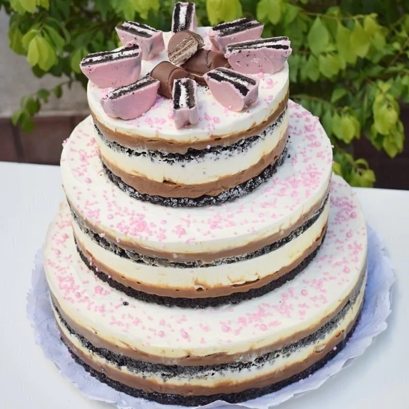 Base Oreo, dulce de leche, crema y Oreos bañadas con detalles rosas