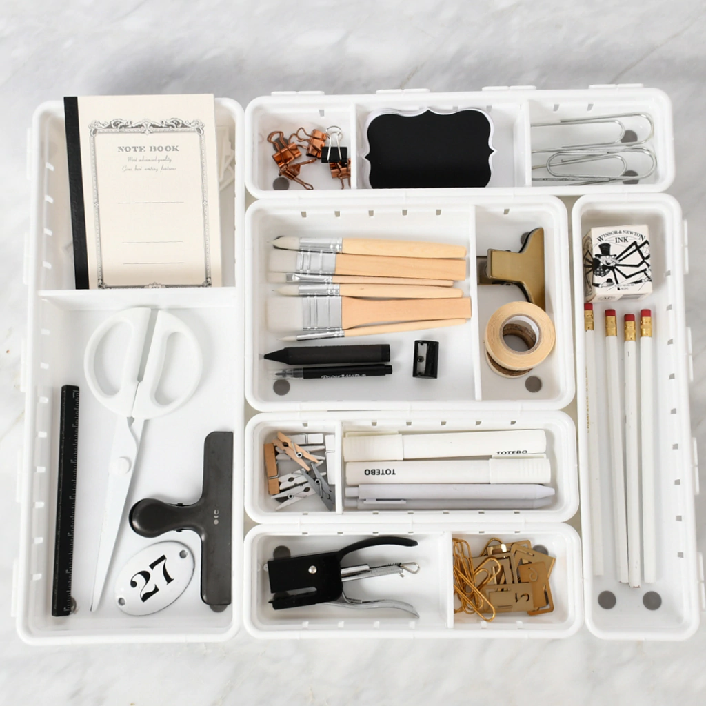 Drawer blanco PU9973Medidas : 37,5 cm ancho x 15,4 cm profundidad x 5 cm alto.Con 2 separadores moviles para adaptarse a tu necesidades.Este sistema modular ayuda a optimizar los espacios y clasificar el contendido de forma practica.
