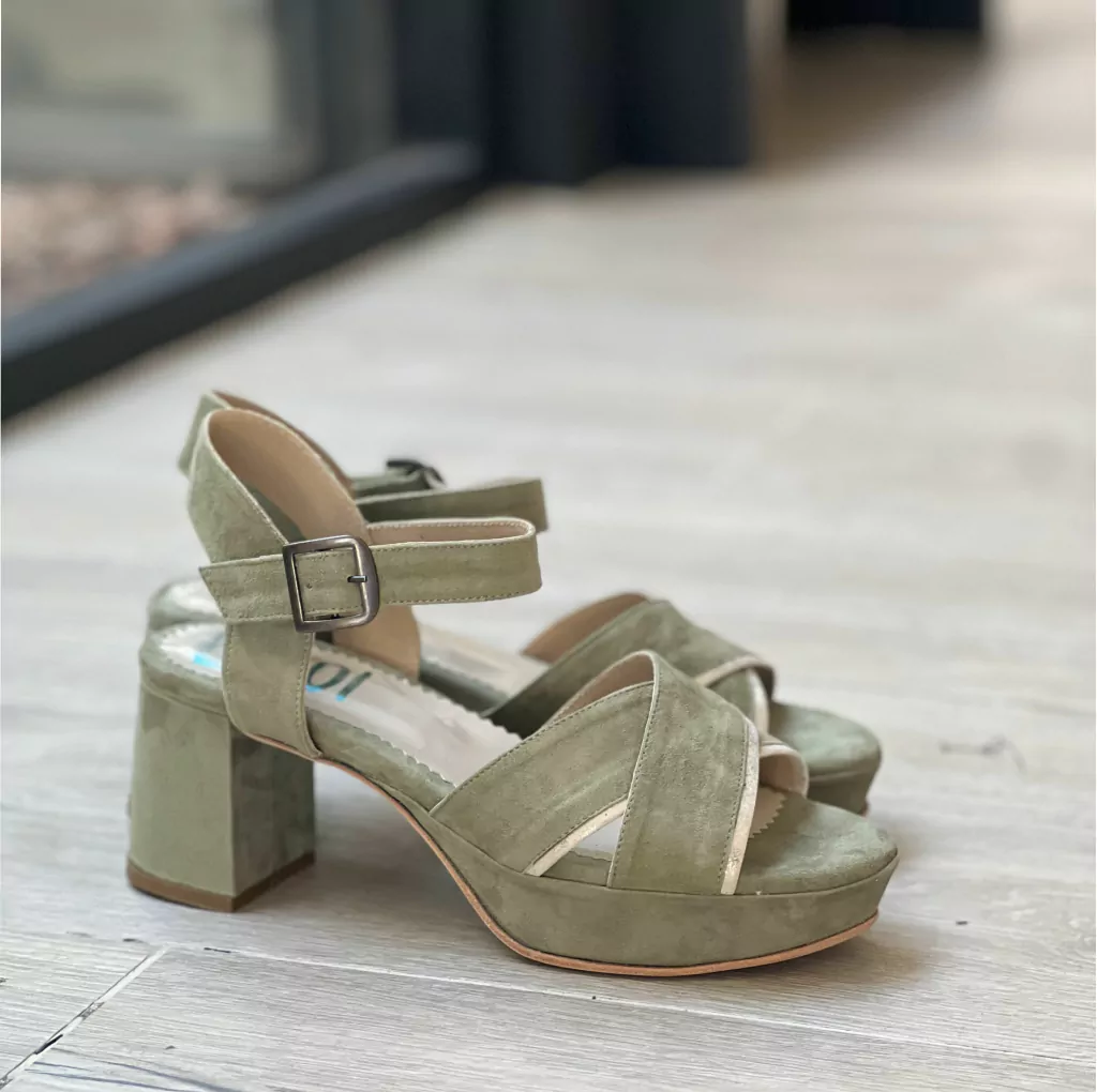 La delicadeza de esta combinacion es todo !!! Y si te estas casando, este color es divino para combinar con ramos de hojas secas !!!Material: Cabra gamuzada en color verde seco y tiene un ribete en micropunto dorado con forreria de chancho lustrado!Taco 5 cm Elefante, con plataforma de 3 cmSuela Vacuna.* Tene en cuenta que a la altura del taco tenes que sumarle 1,5 cm por la plantilla y la tapita del taco.Es un Producto Artesanal y el cuero es piel natural, por lo que puede tener pequeños detalles propios de la misma imperfeccion de la piel.* Si el talle que buscas no esta en stock se puede encargar, el tiempo de producción es de 3 semanas y el valor es el mismo al que esta publicado.* Este modelo tambien se puede hacer a pedido variando los cueros, el taco y la plataforma. En este caso, el valor es el de a pedido. Si queres saber mas escribinos a[email protected]