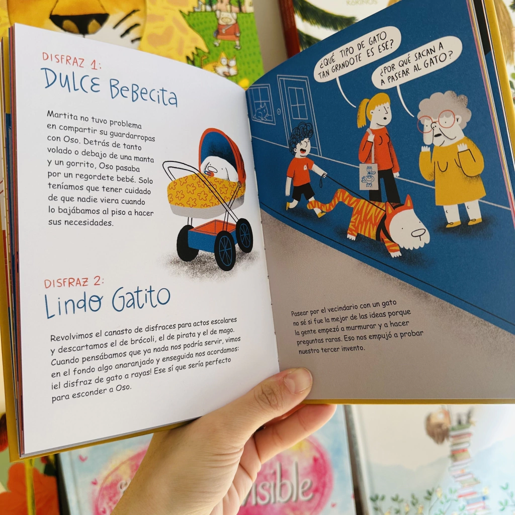 -porque además de pianista, su mamá es muy estricta-, pero los dos hermanos más grandes consiguen un permiso especial para ir a jugar a la plaza. Y entonces ¡pasa algo increíble! Atrás de un arbusto descubren algo raro. Algo adorable. Algo que en su casa está terminantemente prohibido. Los chicos están fascinados, pero hay un gran problema: ¿cómo adoptar a Oso -así llaman al perro que acaban de encontrar- y llevarlo a casa sin que mamá se dé cuenta?