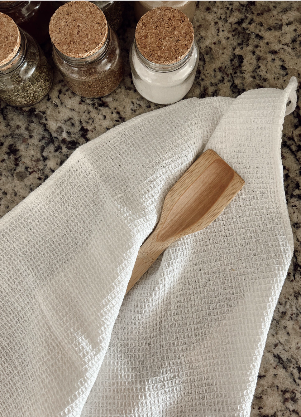 Paños de cocina de tela Waffle. 100% algodón. Cuenta con tirita en una esquina para colgar.