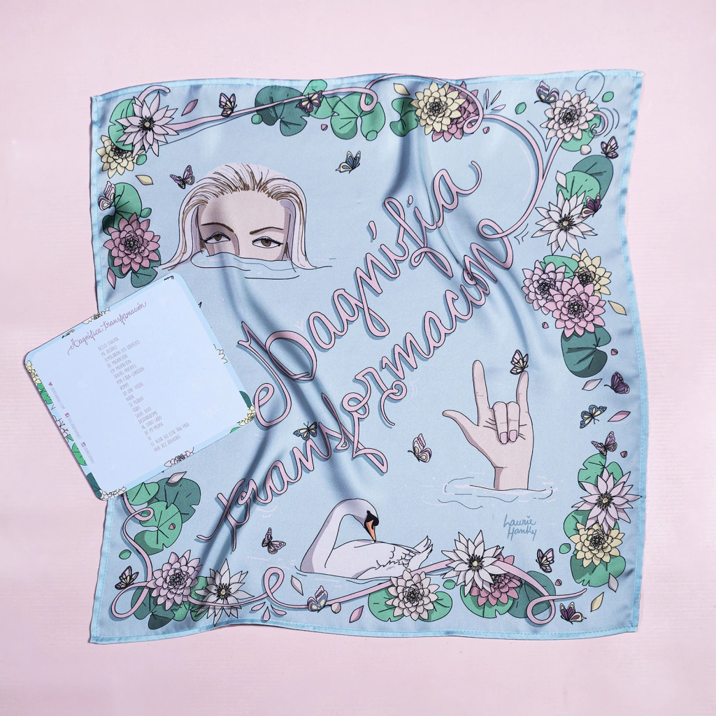 Magnífica transformación. Precioso pañuelo con poesía. 100% poliéster mate súper suave. El pañuelo mediano mide unos 68 x 68 cm, aproximadamente y viene en su packaging de papel Chambril de 240 gr. que incluye el poema alusivo. Una paquetería.