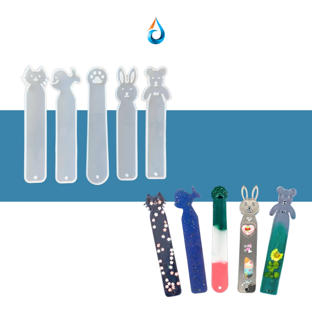 Pack de 5 Moldes de silicona con formas de Señalador de Animales para Resina EpoxiIncluye Señalador con forma de Gato, Ballena, Conejo, Oso, Patita.Medidas aproximadas molde señaladores: 14,1 x 2,6 cm