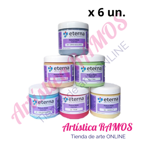 Pintura a la Tiza - Chalk Paint ETERNA x 200ml6 x 200mlNO INCLUYE COLORES FLUOColores a Elección - hasta 2 potes por colorCOMO ELEGIR LOS COLORES:Muy Sencillo: Una vez cargado el producto en el carrito y llenado los datos de envío, en la sección forma de pago tendrás un casillero de "Notas" Donde podrás escribir los colores.IMPORTANTE: Solicitar carta o indicar los colores en "Notas del Cliente" antes de abonar. También podes pedirnos los colores por whatsapp antes o al finalizar la compra. Si pasadas las 12hs de realizada la compra no se eligieron los colores, los mismos serán seleccionados equitativamente, abarcando toda la paleta y sin repetir.¿QUÉ ES? Y ¿CÓMO SE USA?La pintura mateChalk Paint Eternaes una pintura al agua deacabado extra mateideal para pintar muebles y objetos de gran tamaño.Se pinta directamente, la superficie no requiere de ninguna preparación previa. Se aplica con brocha o pinceleta sin necesidad de seguir la veta de la madera. Debido a la composición de esta pintura el área pintada quedará pareja y nivelada.En piezas con restos de otros materiales es necesario quitarlos con un trapo húmedo y alcohol. En otras superficies no porosas lijar suavemente para mejorar la adherencia.En todos los casos se debe aplicar como protección una capa final deCera CKP Eterna o Barniz Extramate Eterna, ambos ideales para técnicas de Chalk Paint.PRODUCTO PARA USO ARTÍSTICO. LA UTILIZACIÓN POR NIÑOS DEBE SER SUPERVISADA POR ADULTO