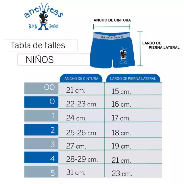 PACK BOXER ANTILLITAS NIÑOPack por mayor 6 unidades de BOXER marca ANTILLITASModelo de algodón, tiro medio y con elástico embutido (elástico suave, y ¡super cómodo!), la tela no genera molestias ni incomodidad.ESPECIFICACIONES TÉCNICAS- Composición: Algodón.- Talles: 00 (1 año), 0 (1 a 2 años), 1 (2 a 4 años), 2 (6 años), 3 (8 años), 4 (10 años)- Colores: Surtidos- Art.:380