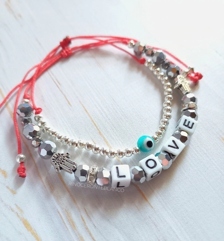 Pack de dos pulseras individuales con base de hilo chino rojo, cuentas de cristal de roca, dijes fundición, cuentas de metal niquel y ojito de vidrio hindu.
