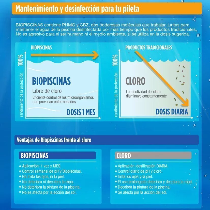 · Control de microorganismos: la presencia de BIOPISCINAS en tu piscina protege tu salud y la de tu familia, eliminando microorganismos que producen
