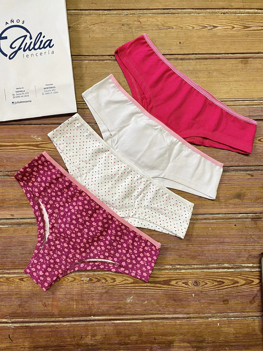 Pack x 4 de culotte clásico. El pack más cómodo que verás hoy. Tiene elástico solo en la cintura.En el cavado y la cola tiene costuras suaves para que marque menos tus prendas.Confeccionadas en algodón 97% y elastano 3%. Es la combinación perfecta para sentir la suavidad del algodón y que mantenga su forma por más tiempo gracias al elastano.Los packs vienen en estampas surtidas, si te gustaría ver y elegir la estampa no dudes en comunicarte con nosotras por WhatsApp con el número de tu pedido para pasarte las opciones disponibles. Igualmente no te preocupes, nosotras nos encargamos de elegir la más canchera especialmente para vos.También tenemos este mismo modelo en versión less búscalo como 76368.