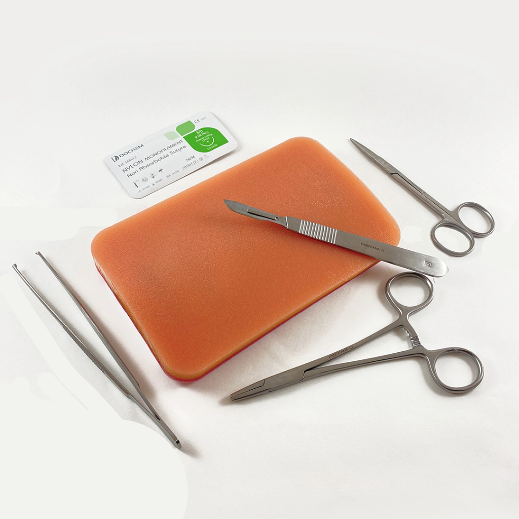 -VERSION 2: EL PAD + INSTUMENTALES: (1) Porta agujas mayo, (1) tijera, (1) pinza de diseccion, (1) mango de bisturi, (1) lamina de bisturi, (1) aguja e hilo de sutura.