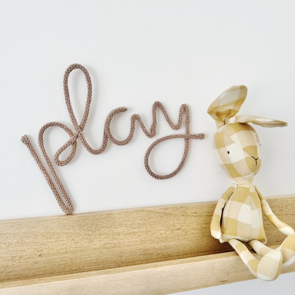 Palabras con estructura de alambre y tejidas por fuera.Miden aprox... Play 27cm, Read 34 cm, Dream 37 cmLos colores pueden variar de la foto*CAMBIOS: los gastos de envío por cambio están a cargo del comprador.