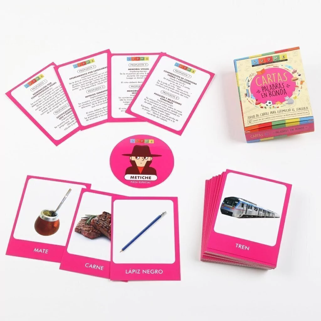 Palabras en ronda es un juego de cartas completo con múltiples variables para la estimulación del lenguaje, tanto en su vertiente expresiva como comprensiva.