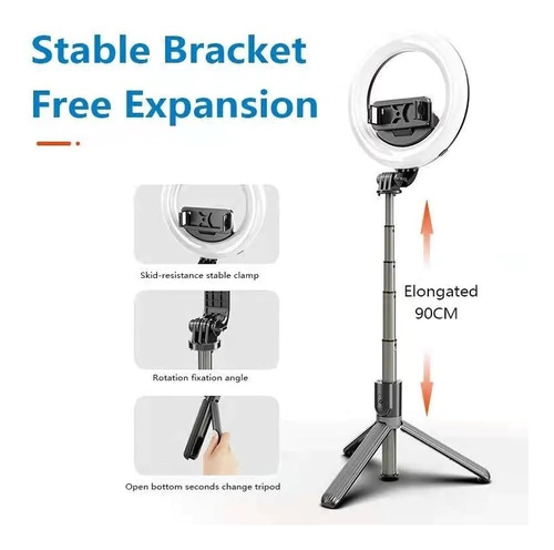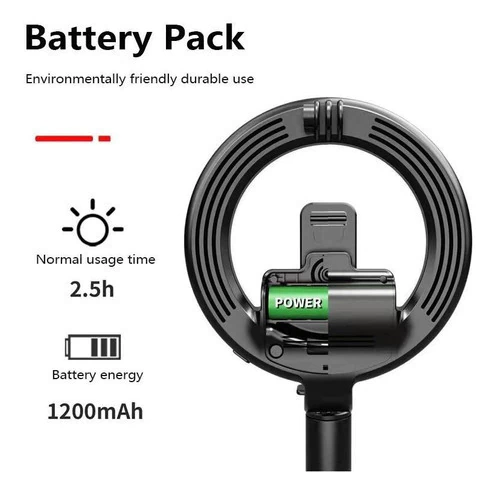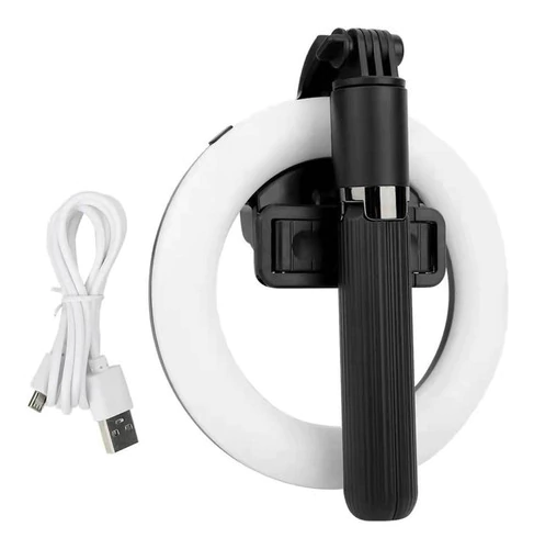 PALO SELFIE RECARGABLE CON ARO DE LUZ LED + TRIPODE 70 CMStick con aro de luz que se puede transformar también en trípode. Dos productos en uno! Cuenta con un estructura innovadora que permite que el grip se abra y se convierta en trípode. El cual también puede extenderse para adaptarlo a la altura que quieras. El aro plegarse para poder guardarlo donde quieras. Fácil de transportar. NOTA: NO SE PUEDE SEPARAR EL ARO LED DEL PALO SELFIE PARA USAR POR SEPARADO. Anillo de luz LED circular de 5 pulgadas que iluminara tus fotos en 3 tonos de luz diferente: blanca, cálida, y amarilla y posee tres tipos de intensidades diferentes por cada color.Este producto puede ser utilizado para diferentes propósitos gracias a sus funcionalidades. Por ejemplo con el tripode, se puede utilizar para streaming en vivo , videos de corto alcance, selfies, maquillaje, como luz de noche. Y con el stick, te podrás tomar las mejores selfies sobre todo en ambientes con poca iluminación o solo para mejorar la calidad de la foto.El soporte para el celular se puede usar de forma horizontal o vertical.Características:-Aro de Luz led de 5 Pulgadas-Trípode 70 Cm-Aro Recargable Usb-Control Bluetooth lleva una pila tipo botón CR1632 (incluida)-Tiempo de uso: 2 horas aprox.-3 Modos de luz-Medidas: 7.3 Cm x 15.7 cm x 17.1 cm.Incluye: x1 Palo Selfie Con Aro de luz led x1 Tripode 70 Cm x1 Manual de uso x1 Cable USB para recargarlo
