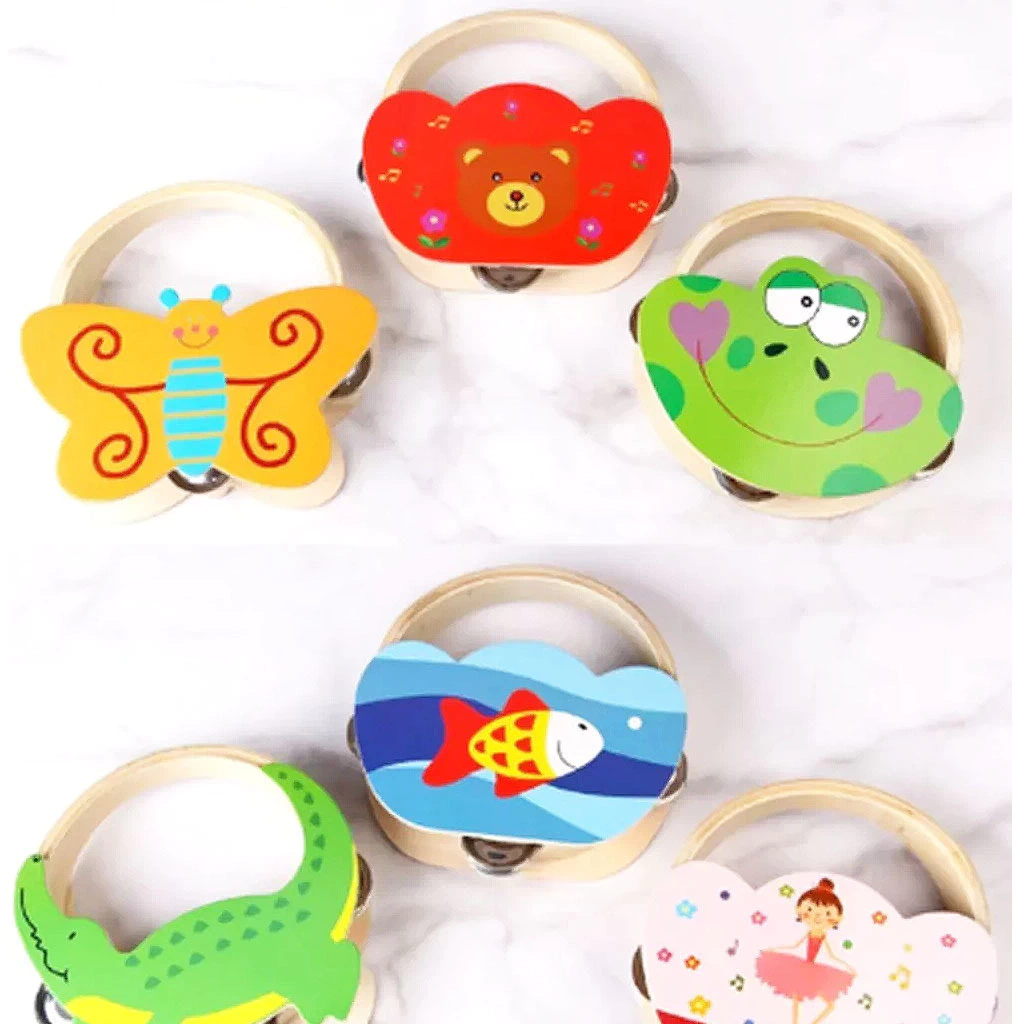 PANDERETA INFANTIL CON EL ARCO DE MADERAIdeal regaloCon estampado de animalitosModelos disponibles: ver en COLORManija/arco de madera y 3 grupos de 2 chapas metálicas cada uno que hacen el ruido de la panderetaMedidas: 15cm ancho x 3,5cm espesor