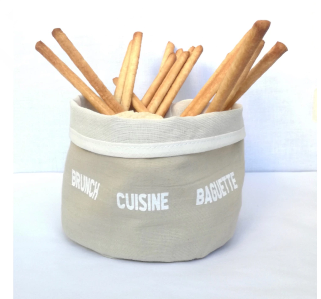 Panera confeccionada en lienzo. Interior forrado.Medidas: 15 cm. de diámetro x 13 cm. de alto.