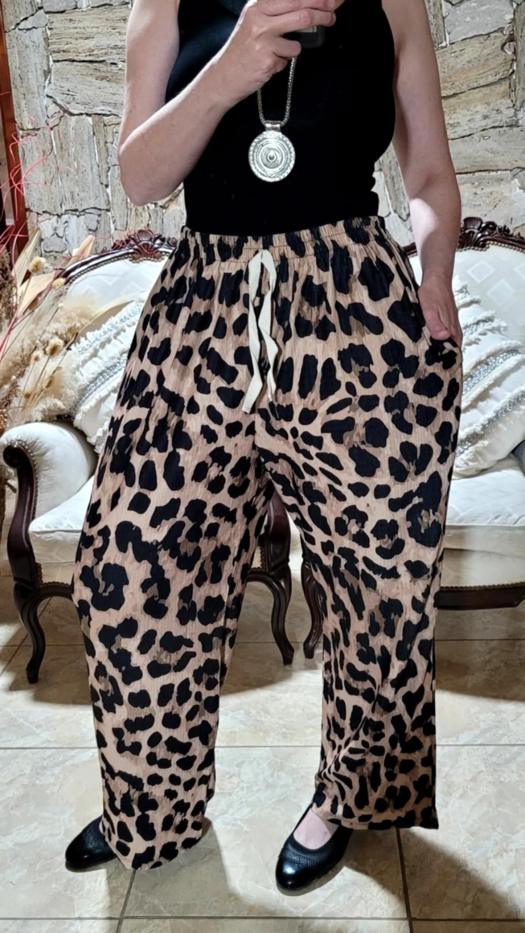 Pantalón palazzo animal print SÚPER AMPLIO, confeccionado en crepe viscosa texturizada, premium, con lycra 100% elastizada. Tiene mucha, mucha elasticidad... Género súper liviano, elastizado, y muy cómodo! Tiene bolsillos laterales, cintura ancha con elástico súper suave y blando por dentro que no marca nada! Posee cordón falso ( está cocido, no regula la cintura ) En éste modelo se fusiona el amor por el print y la comodidad absoluta.. Talle Único SÚPER AMPLIO que se adapta hasta un talle 54/56, aprox. Si te gusta el estilo bien suelto, éste pantalón se adapta aproximadamente a partir de un talle 40/42. Claro que a medida que el talle es más amplio, el pantalón queda menos suelto, y a medida que el talle es más chico, el pantalón queda suelto, o muy suelto, por lo cual es muy importante que leas las medidas que dejamos por tamaño a continuación, y las compares con las de tu cuerpo.