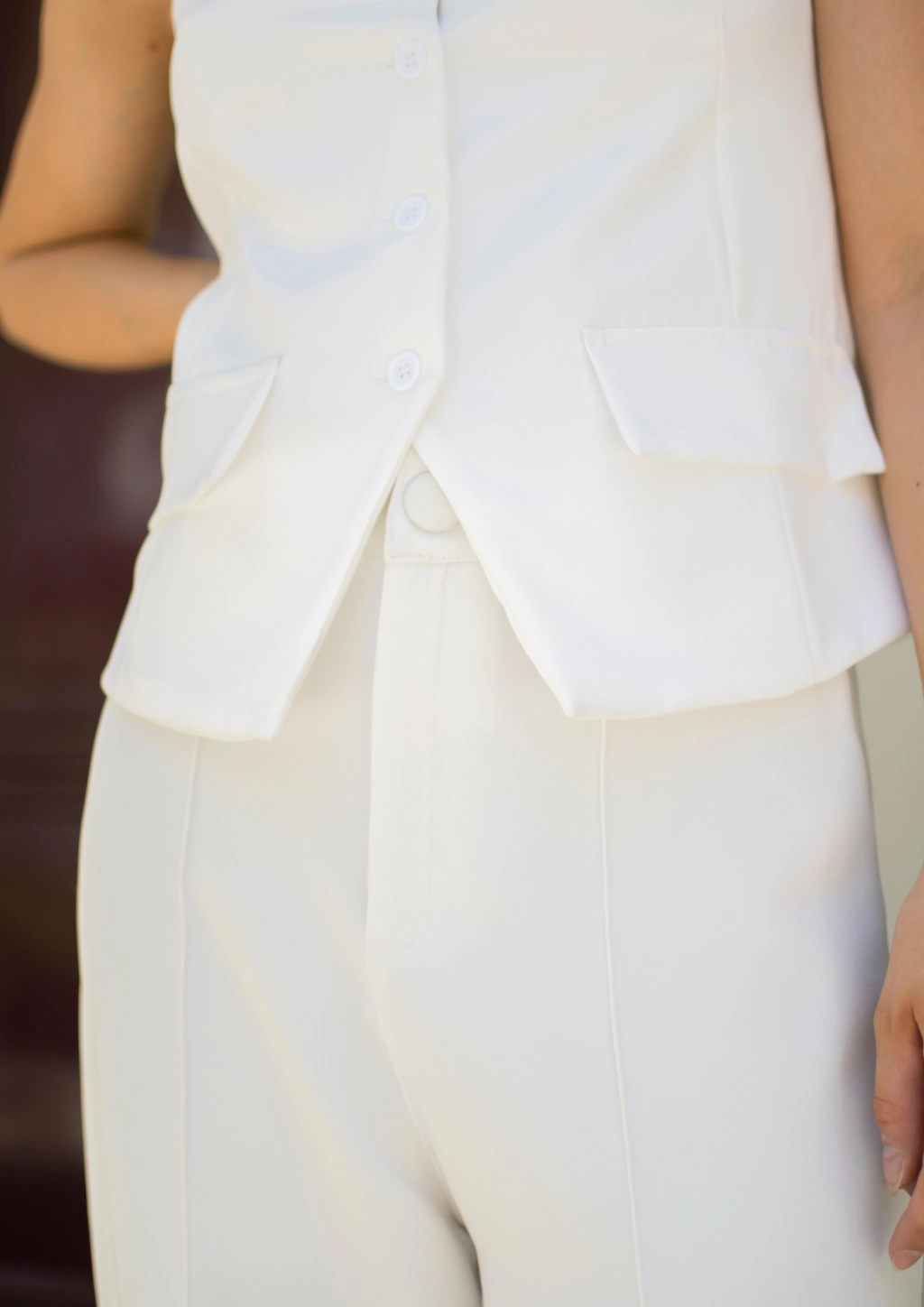 Pantalón tiro alto con botón forrado y cierre delantero. Bolsillos a los costados tipo cargo.
