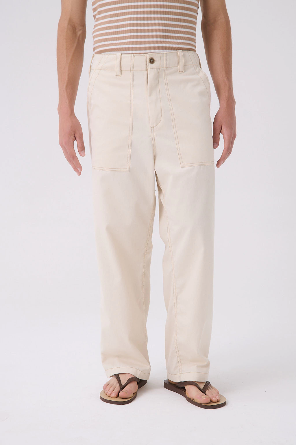 DetallesPantalón de gabardina color natural con costuras a contra tono color tostado. Cuenta con dos bolsillos delanteros y dos traseros. Posee elástico en la parte posterior de la cintura, lo que le otorga un mejor calce y adaptabilidad.Sobre la tela: suave al tacto.Sobre el corte: recto y relajado.Composición y cuidadosAlgodónFitEl modelo mide 1,84 m. y está usando un talle M.Guía de tallesRecomendamos comparar con un pantalón que tengas y te guste. Colocar en una superficie plana para tomar las medidas como se ve en el dibujo.Cintura (Ci): Desde una punta a la otra.Largo (L):Desde la cintura hasta la botamanga.Bota (B): Botamanga de una punta a la otra.Cadera (Ca): A 8 cm del tiro, el ancho de lado a lado.TalleCintura (Ci)Largo (L)Bota (B)Cadera (Ca)S401022355M411032457L421052660XL431072862