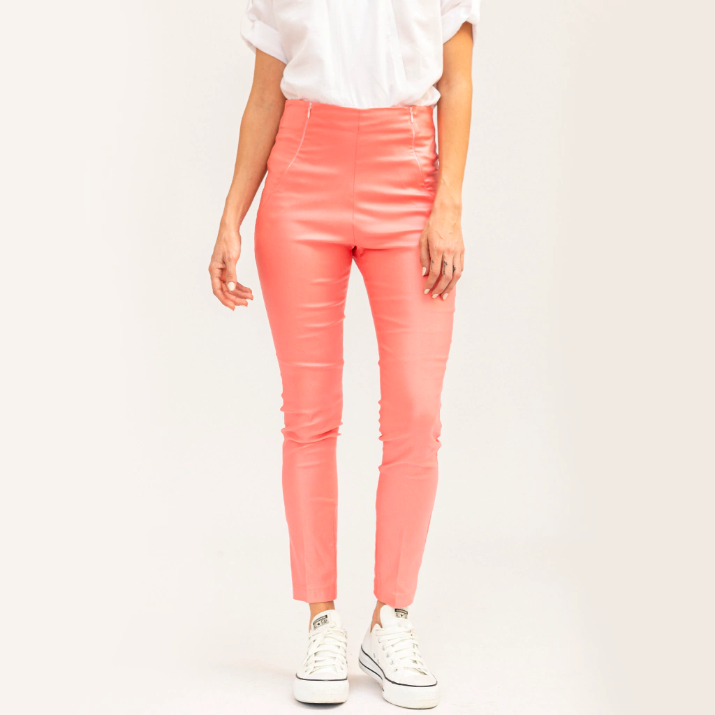 Pantalón elastizado de bengalina chicle, tiro alto con doble cierre delantero y corte achupinado.