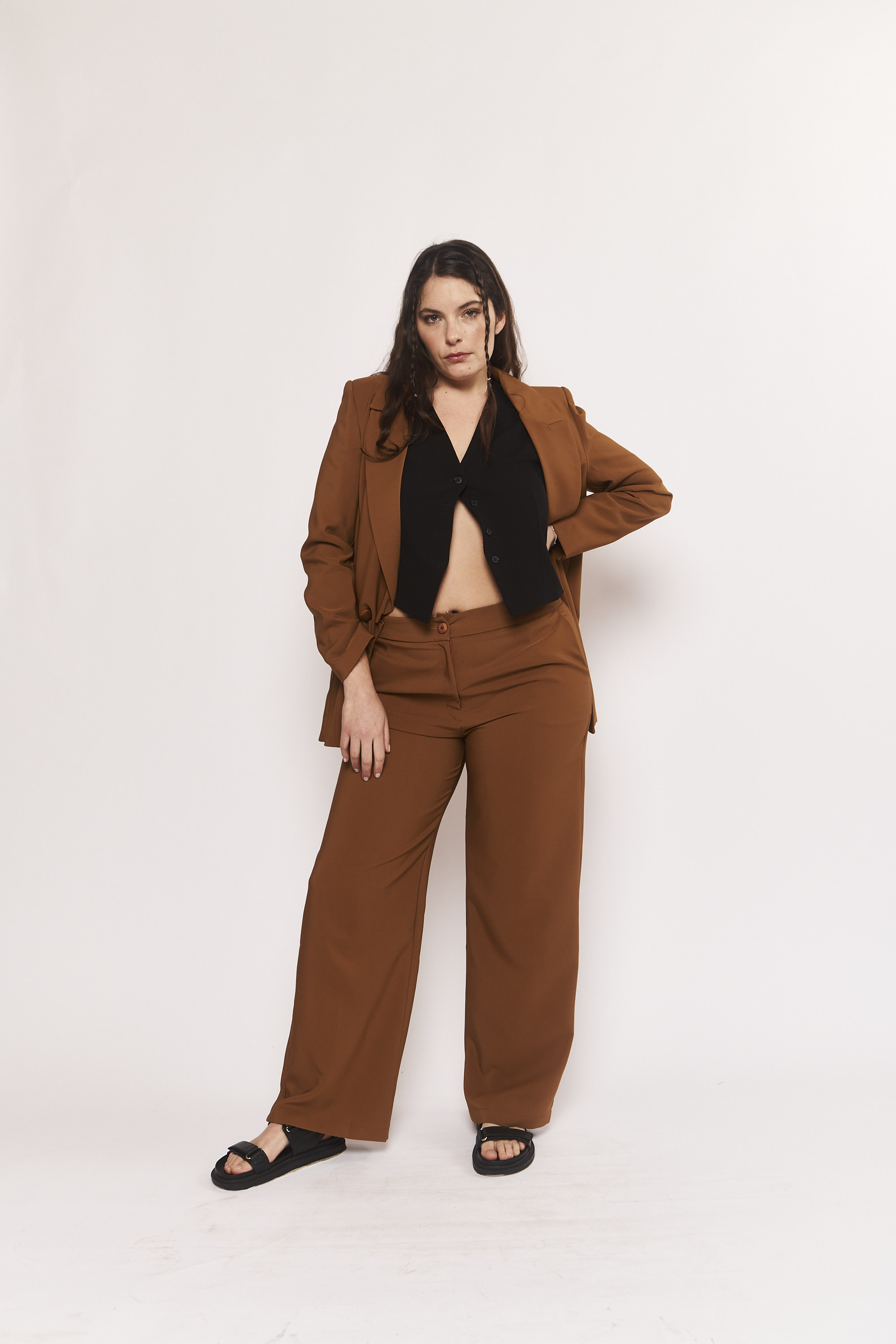 TIP: Un pantalón clásico, cómodo y versátil. Es un comodín para lookearlo para el trabajo con camisas y sacos, para el día con remera, chaleco y zapatillas o para la noche con un top protagonista y botas. Llevalo en tu talle para un tiro más alto, o llevalo un talle más para que quede un poco holgado y en un tiro medio.