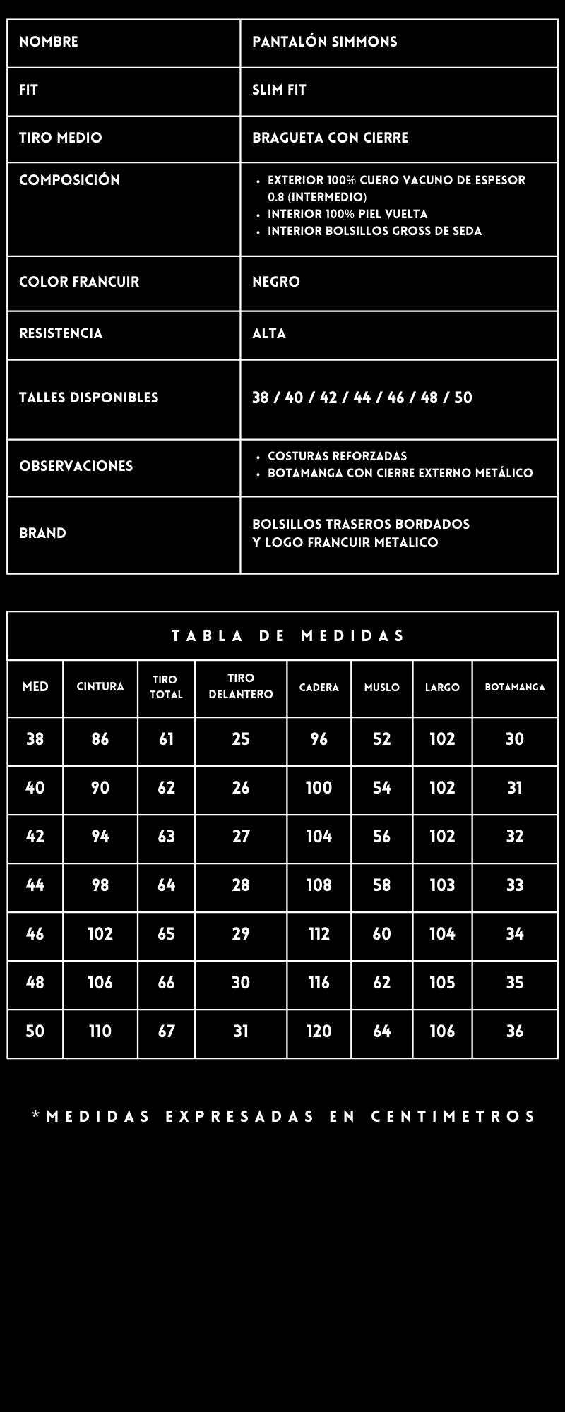 Pantalón de cuero estilo Biker de corte Slim. Confeccionado en piel vacuna de alta resistencia. Detalles intervenidos a mano. Posee parches de canalé matelaseado reforzados ubicados a la altura de las rodillas. Costuras dobles reforzadas y bolsillos con tira-cierre de cuero, a la altura de los muslos y cierres externos en botamanga regulable. Insignia FRANCUIR metálica a juego con herrajes en bolsillo trasero derecho.